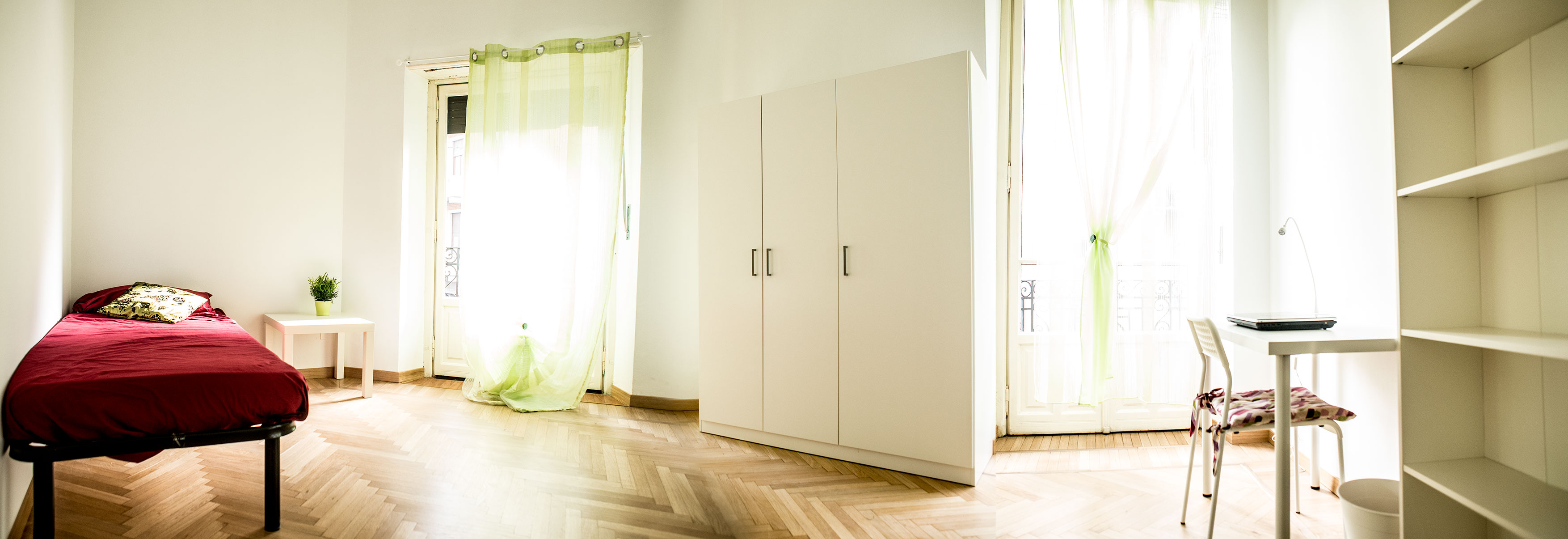 Camera singola arredata di recente con letto da una piazza e mezza, armadio, scrivania, libreria. Molto ampia e luminosa con 2 balconcini. Il costo mensile è forfettario ed è comprensivo di tutte le spese: luce, gas, riscaldamento, internet, acqua, spese condominiali ed immondizia e pulizie delle aree comuni.