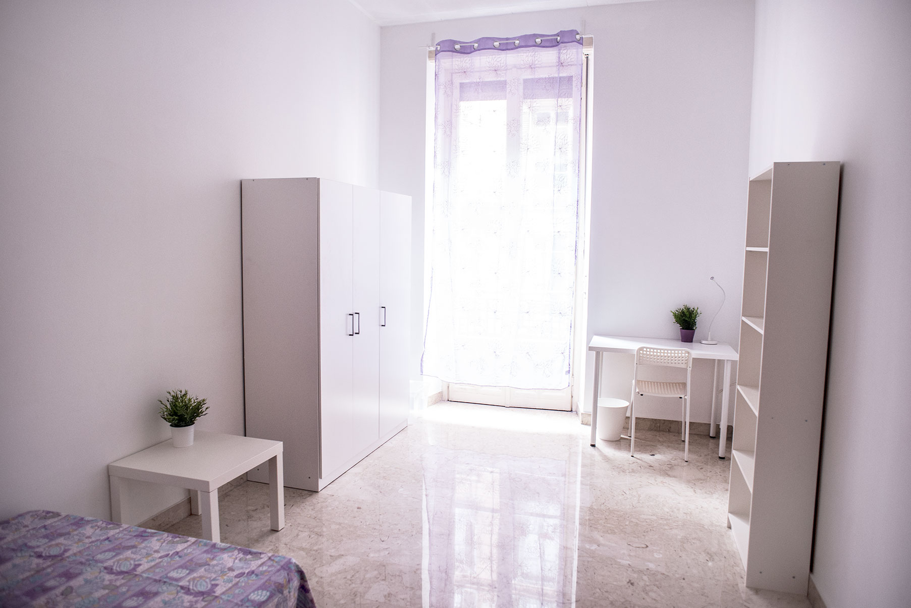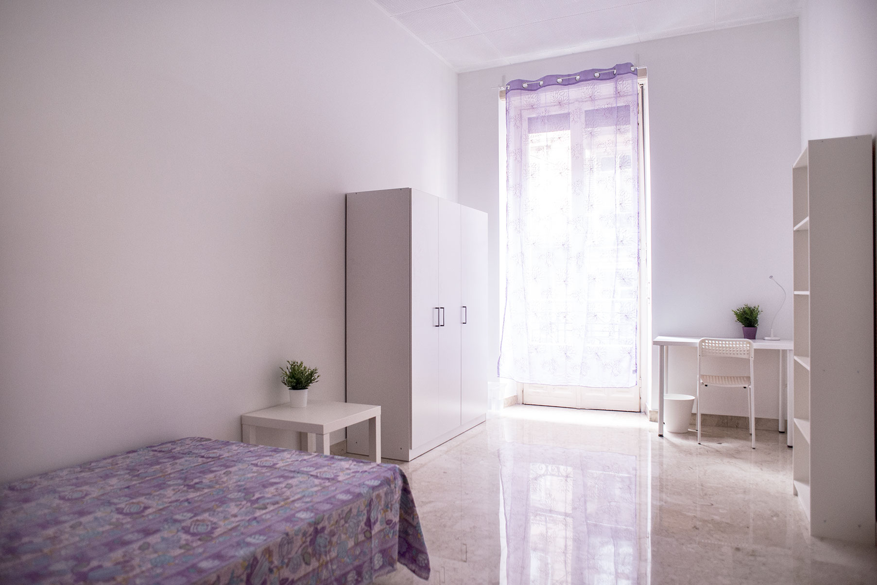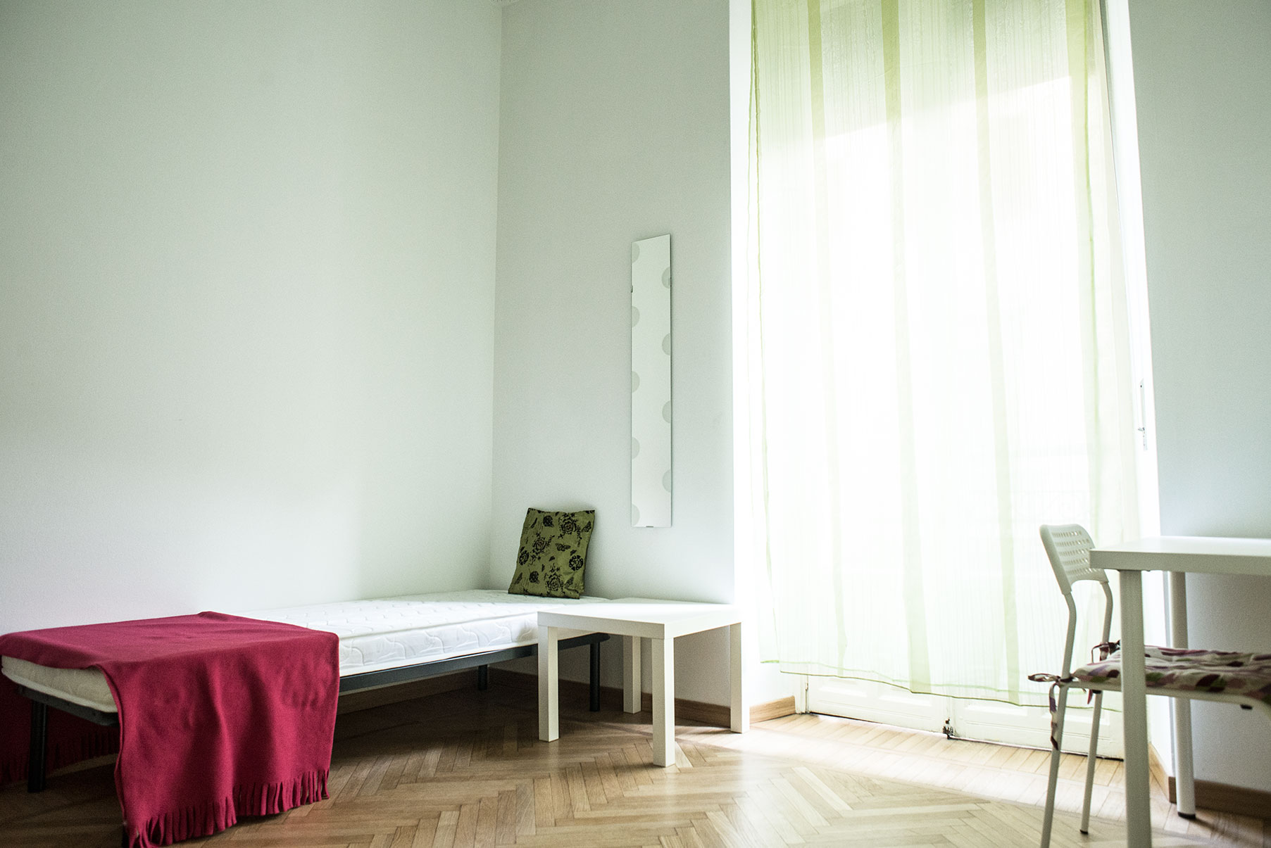 Camera singola arredata di recente con letto singolo, armadio, scrivania, libreria. Molto ampia e luminosa con balcone privato. Il costo mensile è forfettario ed è comprensivo di tutte le spese: luce, gas, riscaldamento, internet, acqua, spese condominiali ed immondizia e pulizie delle aree comuni.
