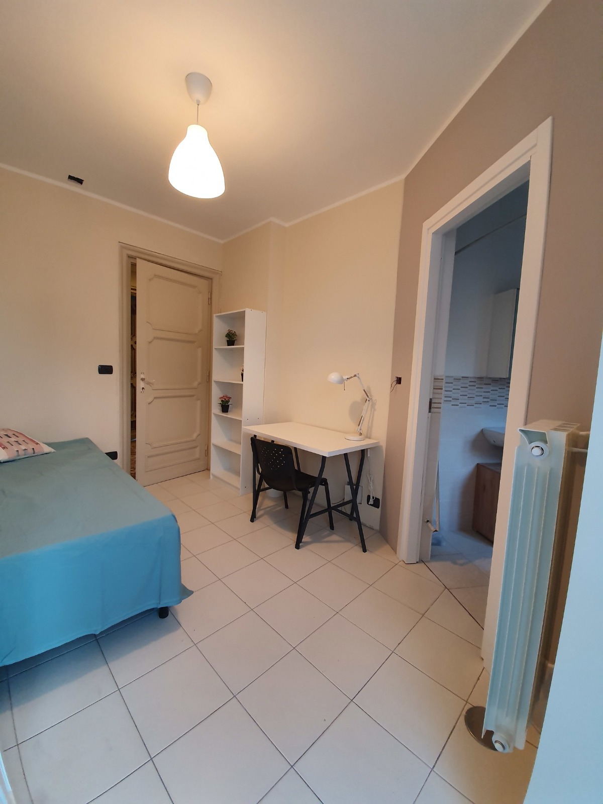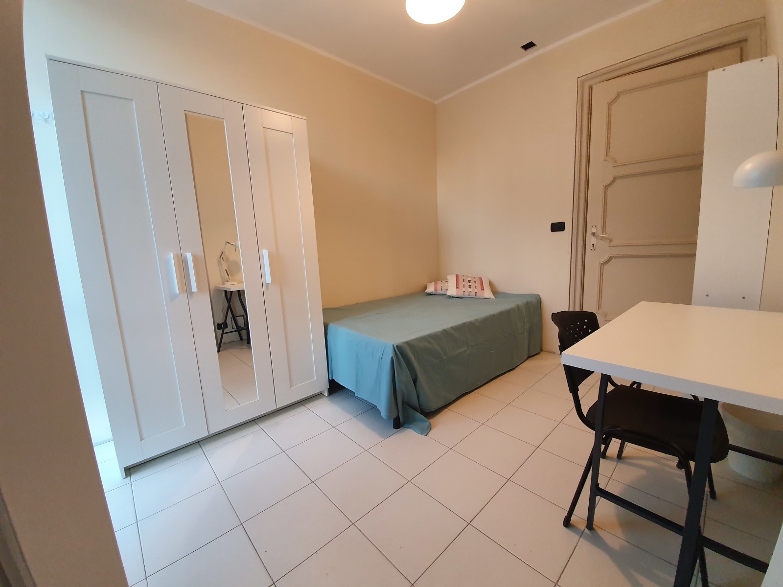 Singola luminosa e arredata con letto a 1 piazza e mezza, scrivania, armadio, libreria, sedia, comodino e stendino.