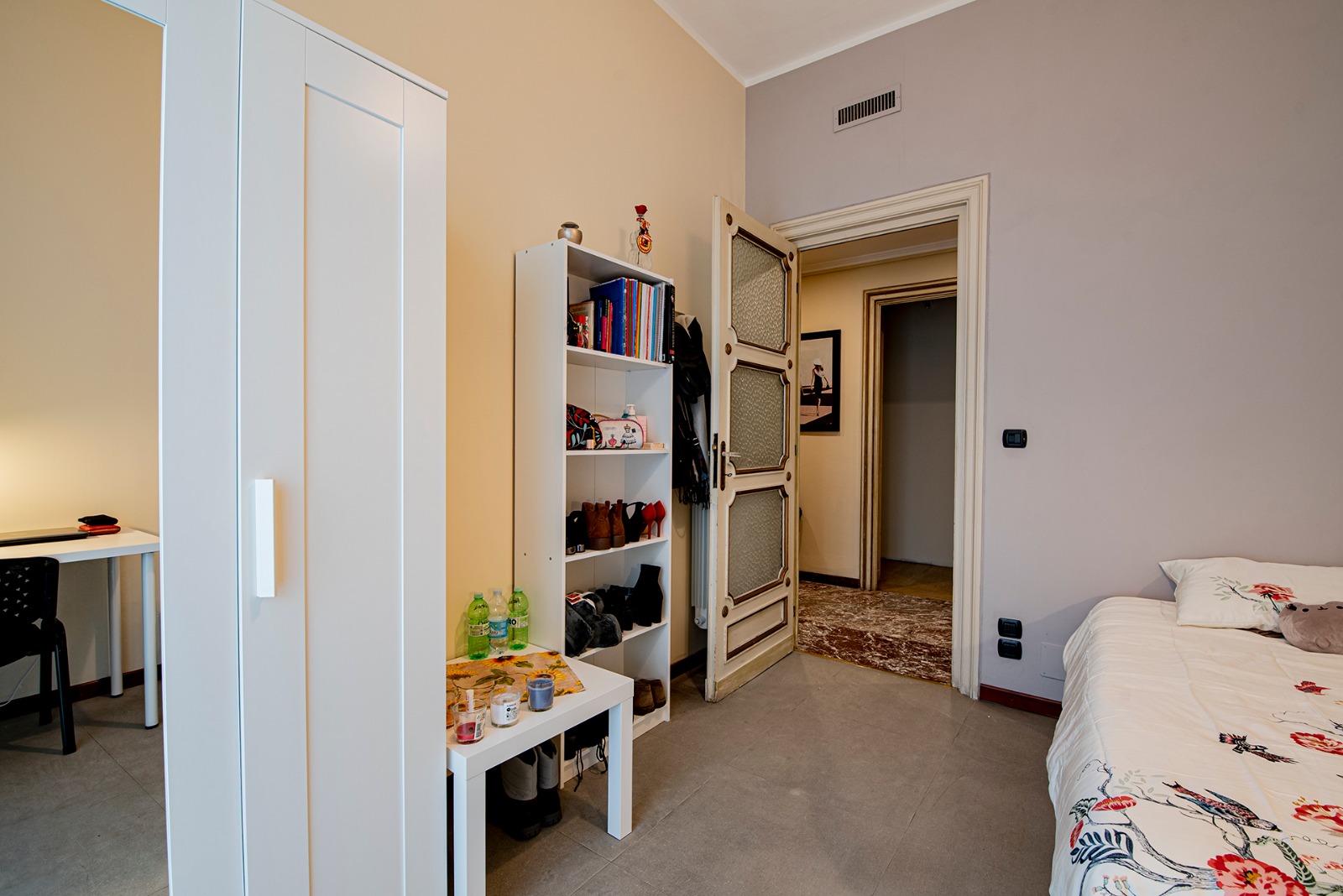Singola luminosa e arredata con letto a 1 piazza e mezza, scrivania, armadio, libreria, sedia, comodino e stendino. Il costo mensile è forfettario ed è comprensivo di: luce, gas, riscaldamento, internet, spese condominiali, immondizia e pulizia degli spazi comuni 1 volta ogni 2 settimane.