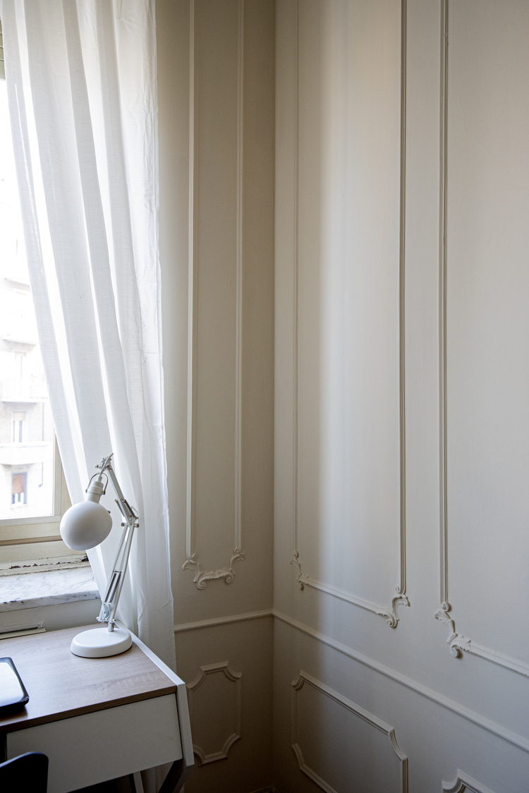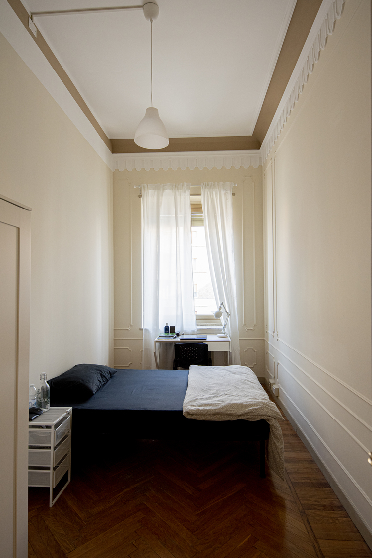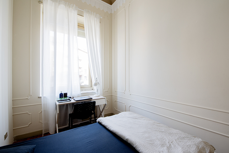 Singola luminosa e arredata con letto a 1 piazza e mezza, scrivania, armadio, libreria, sedia, comodino e stendino. Il costo mensile è forfettario ed è comprensivo di: luce, gas, riscaldamento, internet, spese condominiali, immondizia e pulizia degli spazi comuni 1 volta ogni 2 settimane.