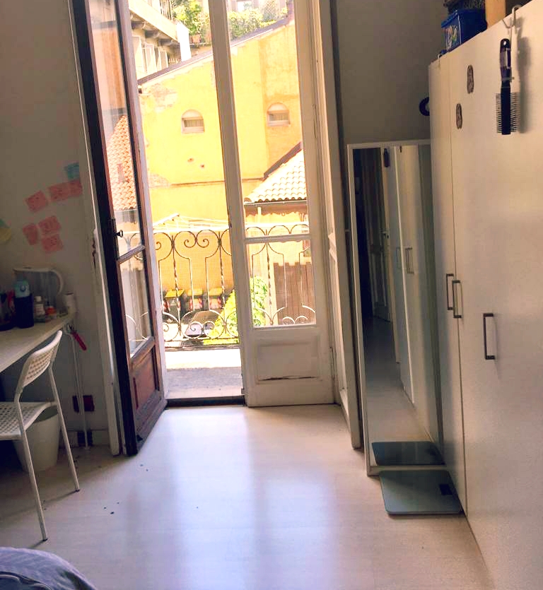 Singola luminosa e arredata con letto piazza e mezza, scrivania, armadio, armadio a muro e sedia. La stanza è dotata di balconcino.