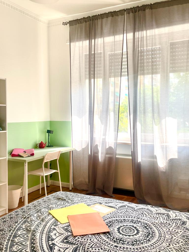 Grande singola luminosa con balconcino e arredata con letto da 1 piazza e mezza, comodino, scrivania, armadio, libreria, stendino e sedia. Il costo mensile è forfettario ed è comprensivo di: luce, gas, riscaldamento, internet, acqua, spese condominiali, tassa rifiuti e pulizie mensili degli spazi comuni.