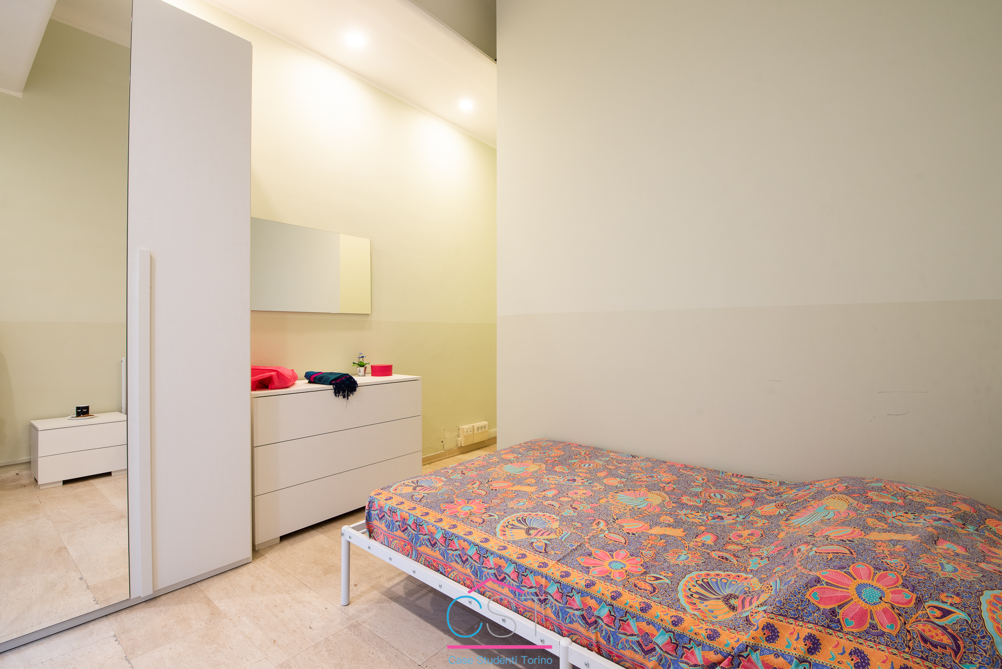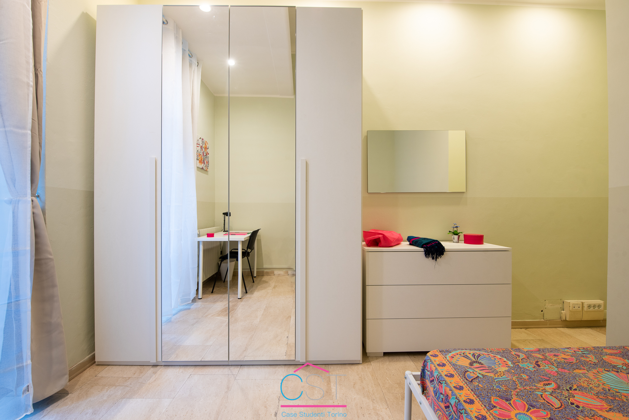 Singola luminosa e arredata con letto a 1 piazza e mezza, comodino, comò con specchiera, scrivania, sedia, armadio e stendino. La stanza ha balcone condiviso. Il costo mensile è forfettario ed è comprensivo di: luce, gas, riscaldamento, internet, spese condominiali, immondizia e pulizia settimanale degli spazi comuni.