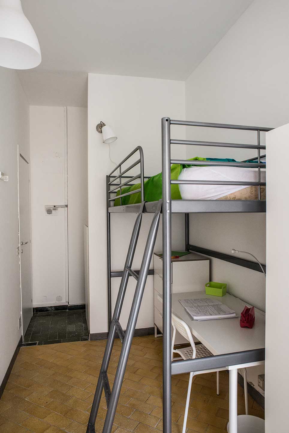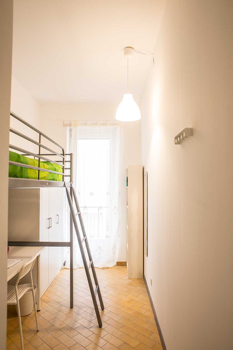 Camera singola arredata di recente con letto singolo a soppalco, armadio, scrivania, libreria. Dotata di balcone e molto luminosa.