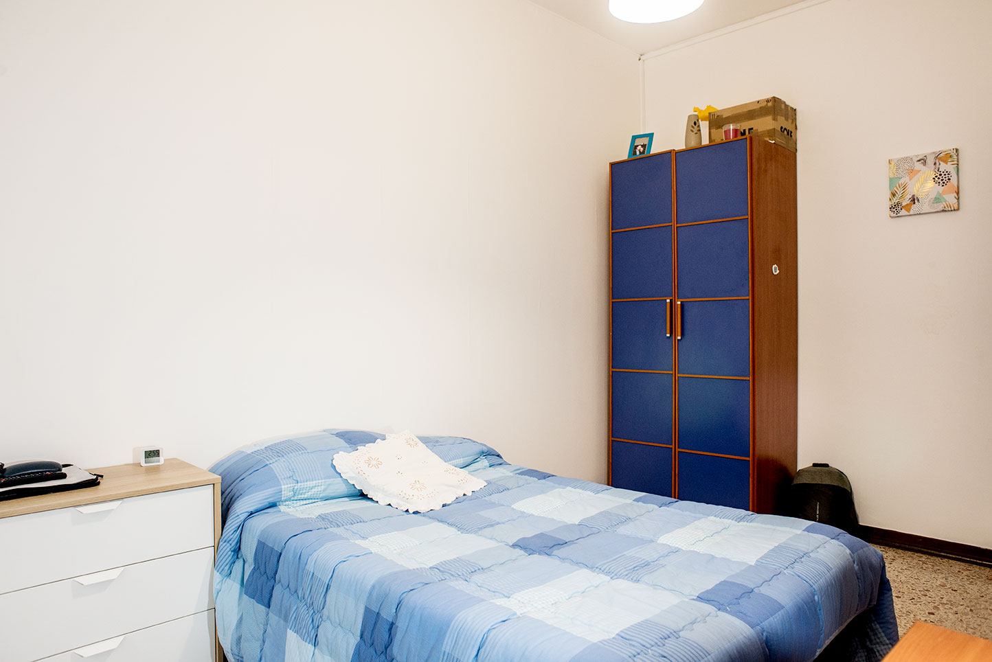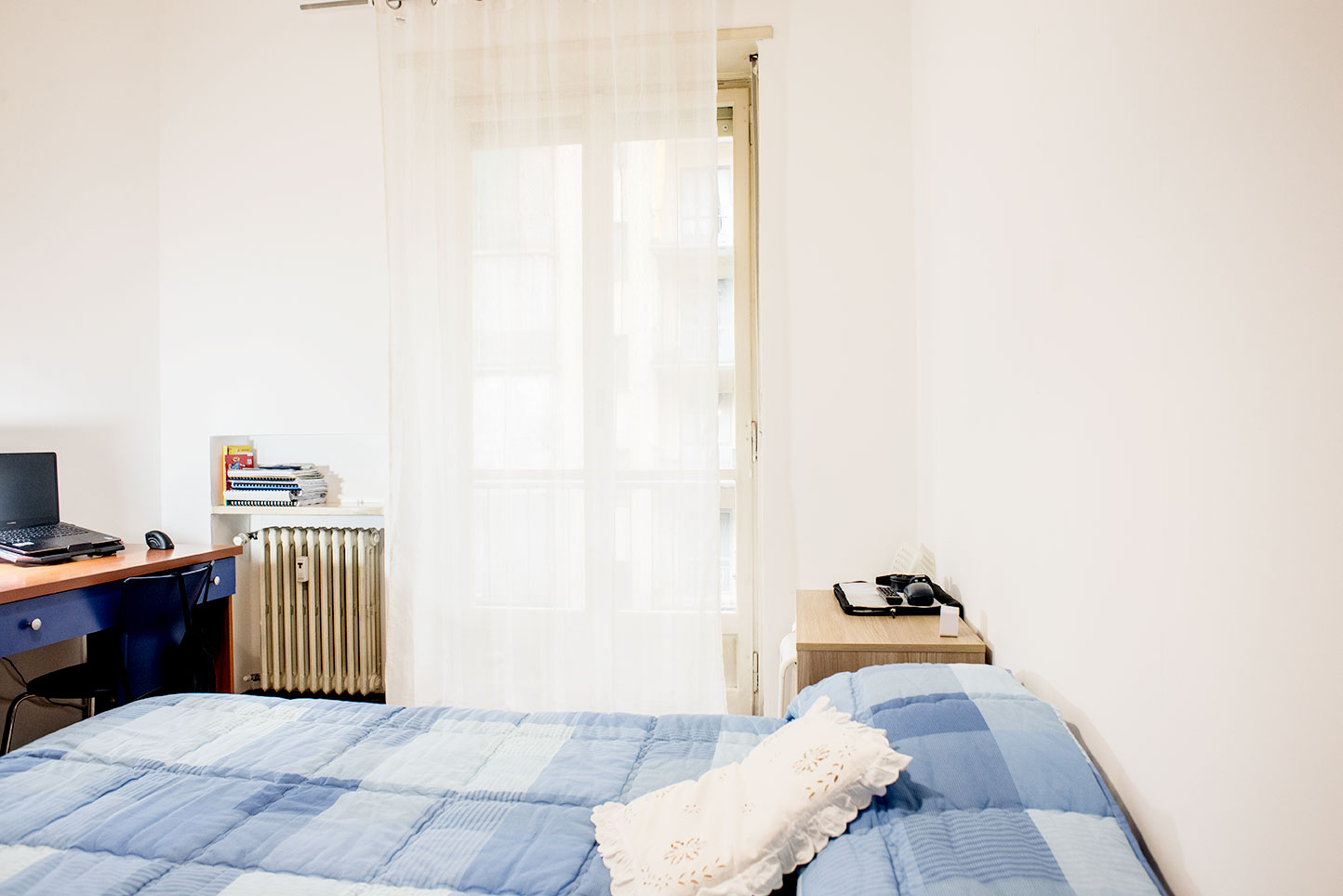 Camera singola arredata di recente con letto da piazza e mezza, armadio, scrivania, libreria. Molto ampia e luminosa con balcone privato.