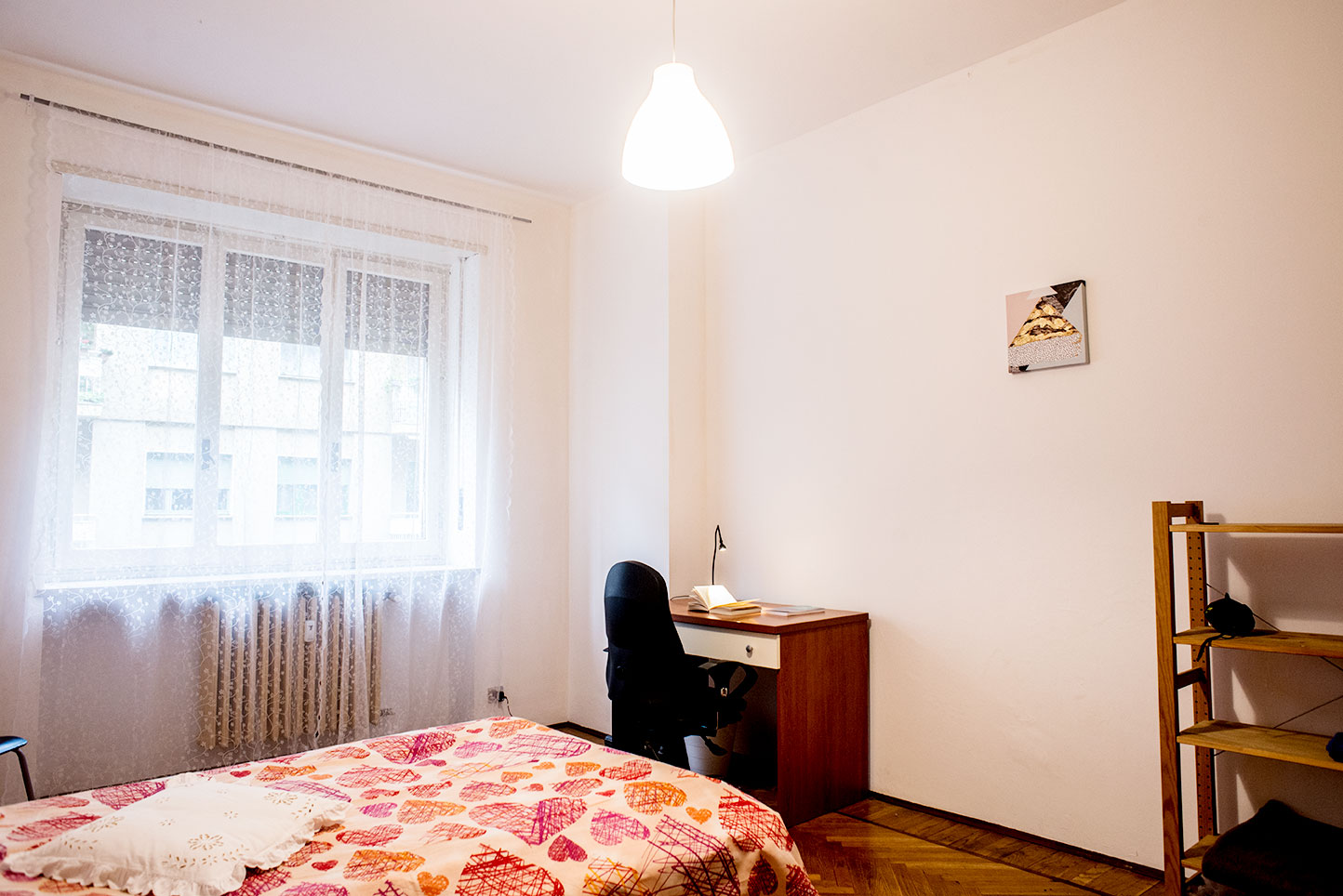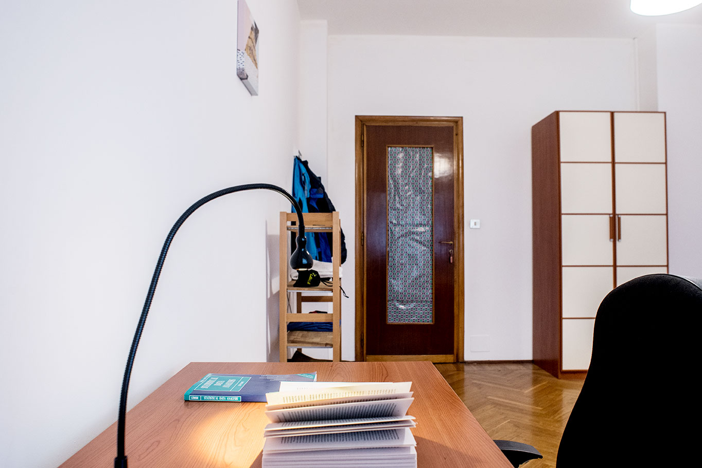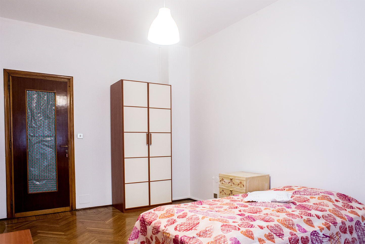 Camera singola arredata di recente con letto da piazza e mezza, armadio, scrivania, libreria. Molto ampia e luminosa.