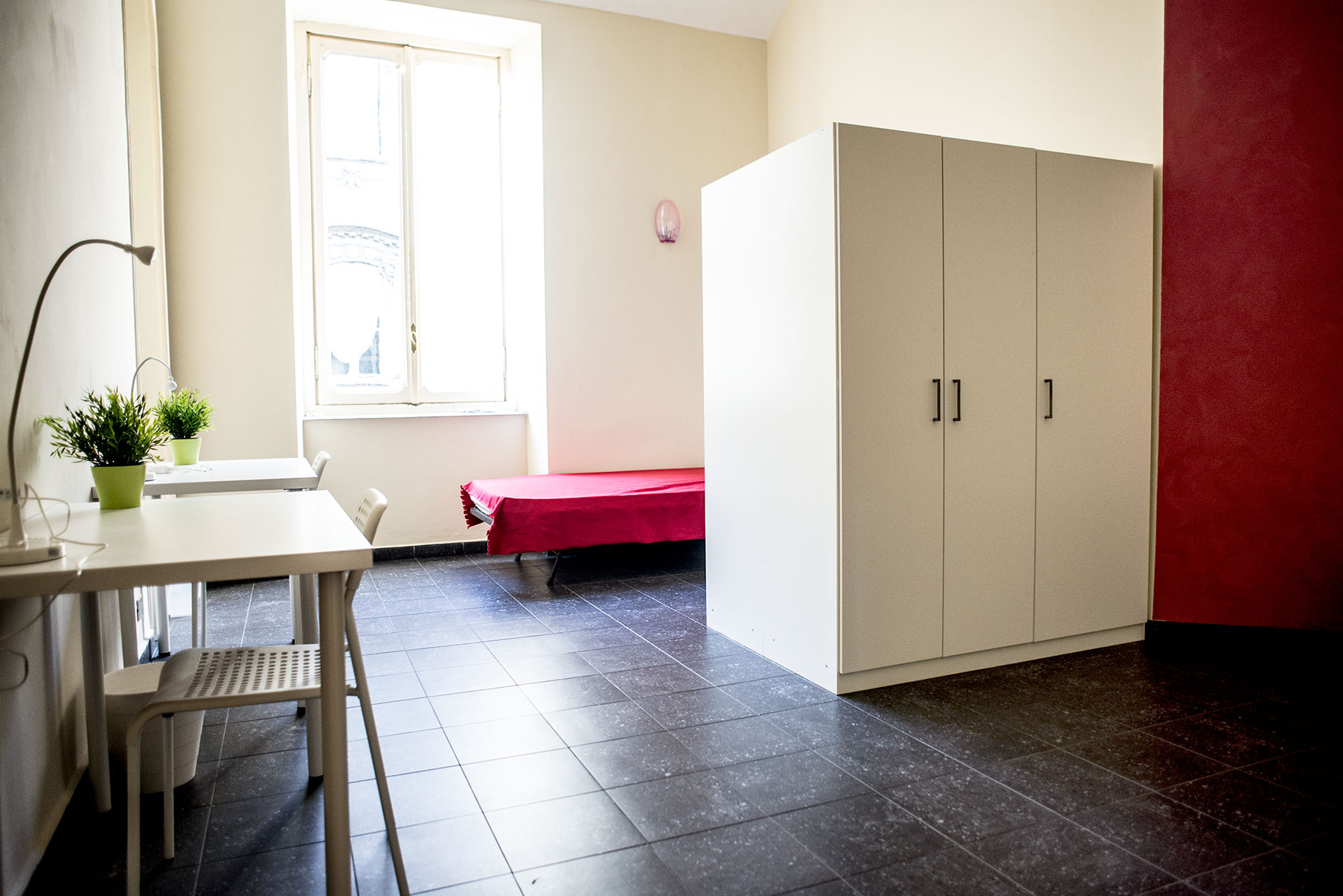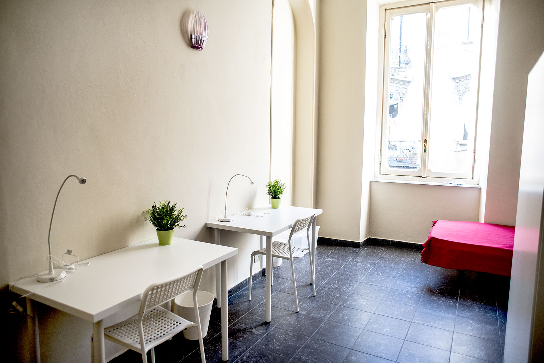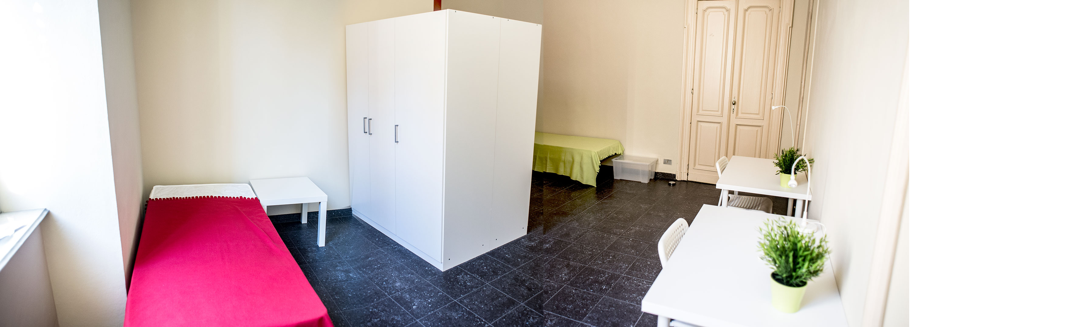 Spaziosa doppia arredata con 2 letti singoli, scrivanie, armadi e sedie.