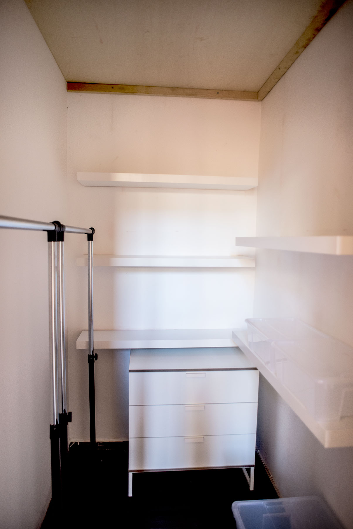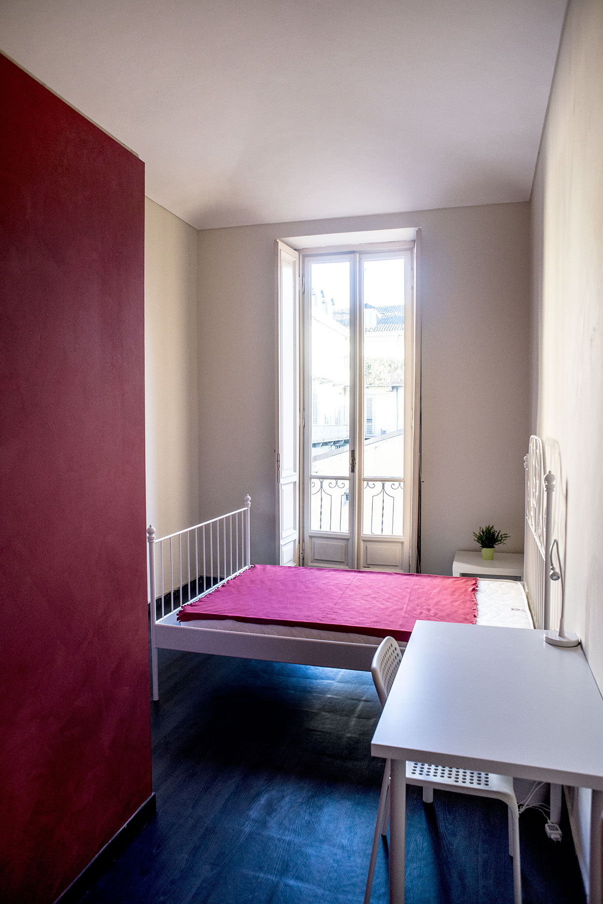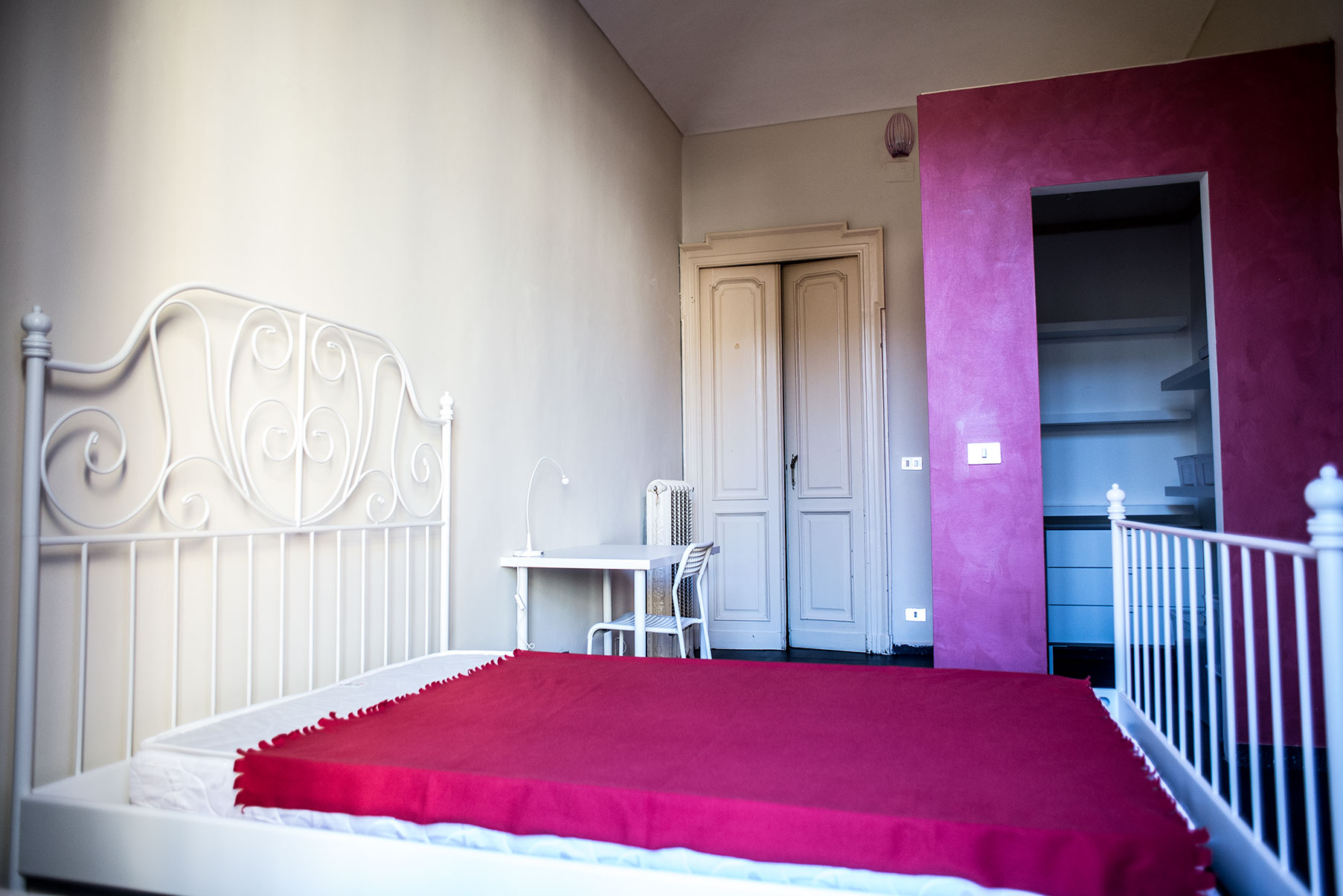 Ampia singola arredata in modo femminile con letto matrimoniale e cabina armadio, scrivania e sedia.