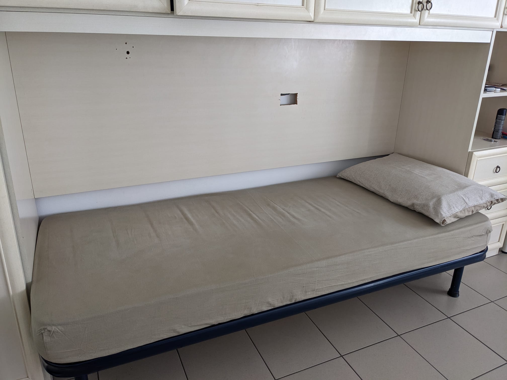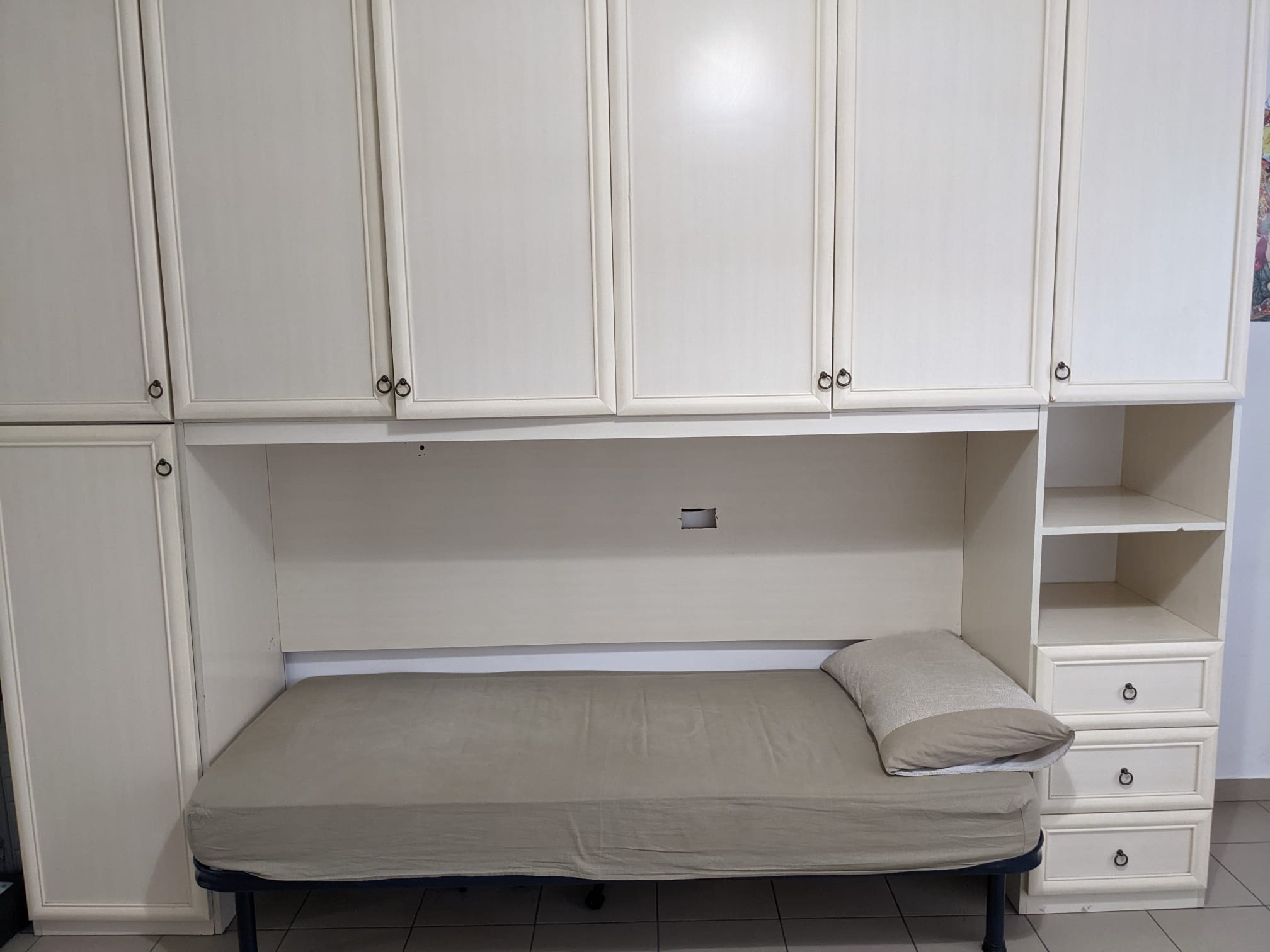 Singola luminosa e arredata con armadio a ponte, letto singolo + singolo estraibile, scrivania e sedia.