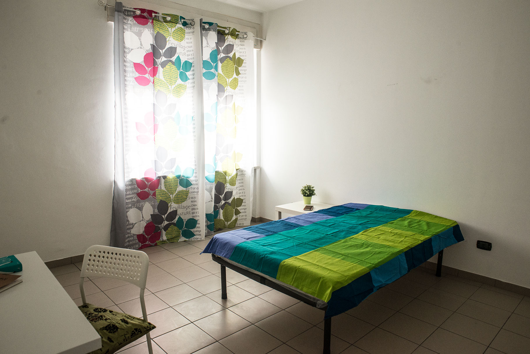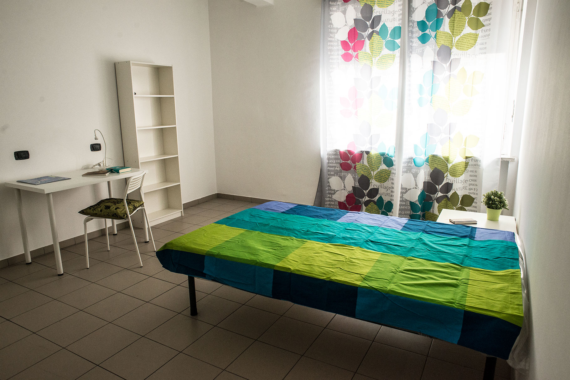 Spaziosa singola luminosa e arredata con letto piazza e mezza, scrivania, armadio e sedia. La