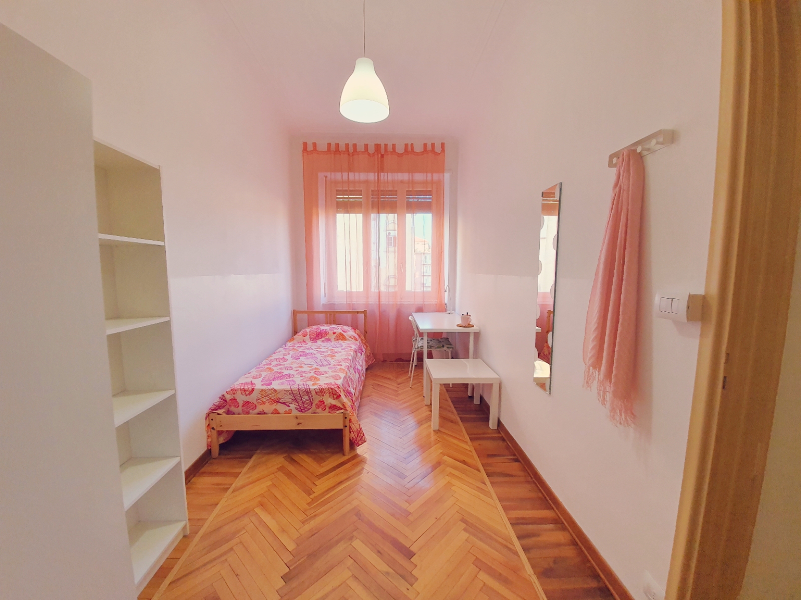 Singola luminosa e arredata con letto singolo, scrivania, armadio e sedia. Il costo mensile è forfettario ed è comprensivo di: luce, gas, riscaldamento, internet, acqua, spese condominiali ed immondizia.