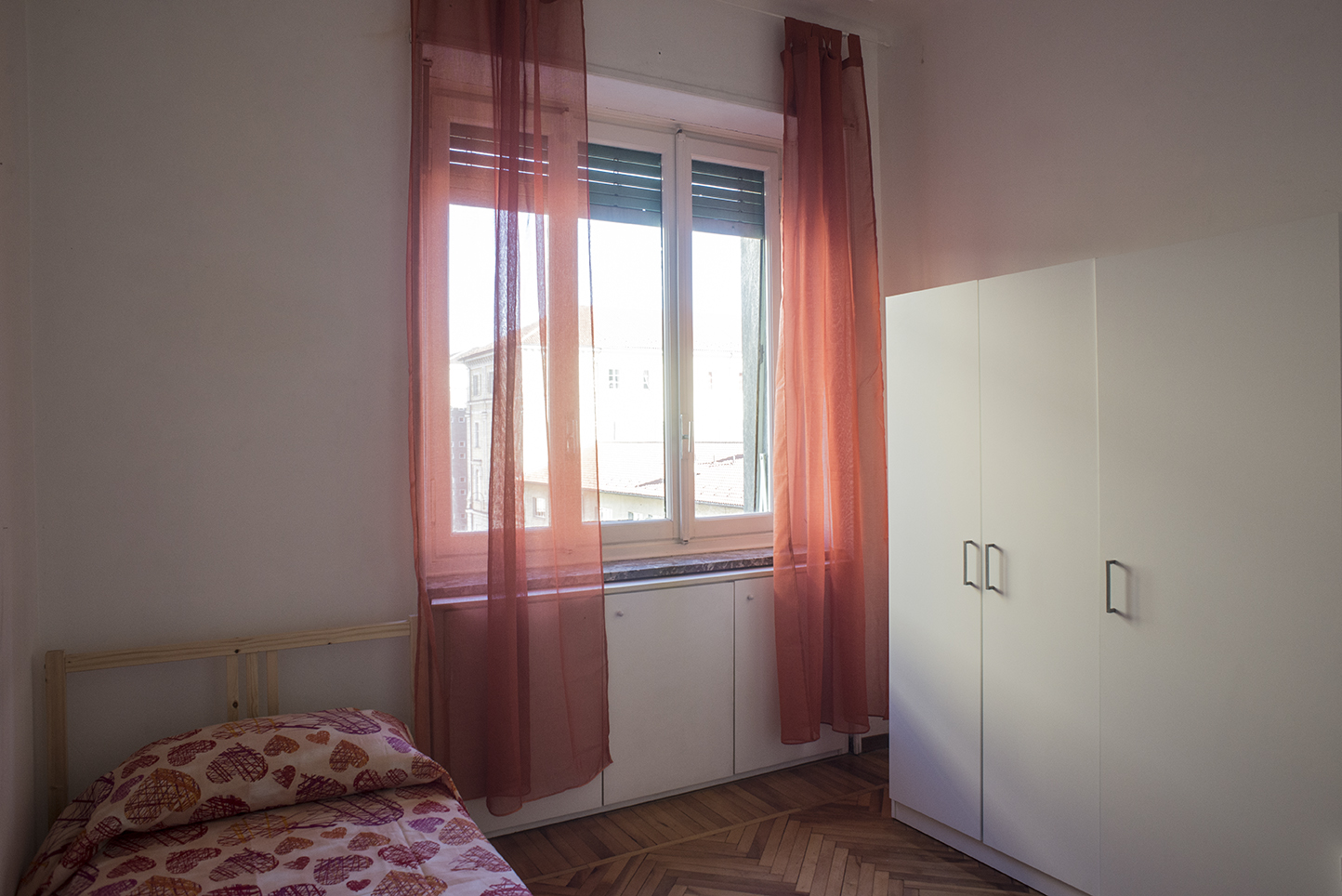 Singola luminosa e arredata con letto singolo, scrivania, armadio e sedia.