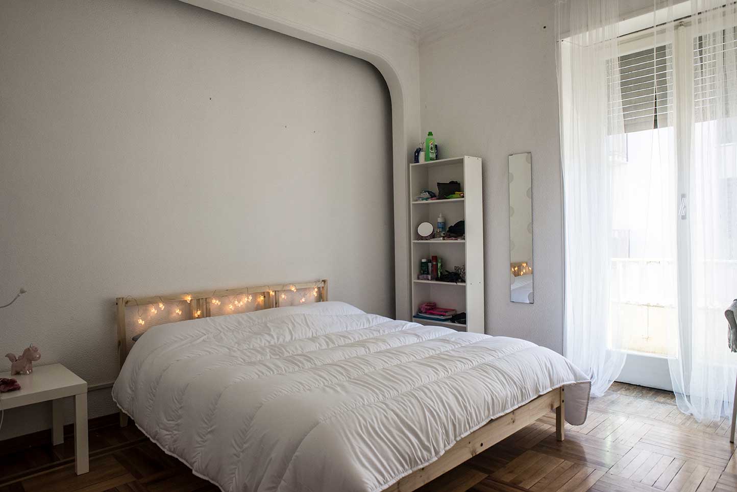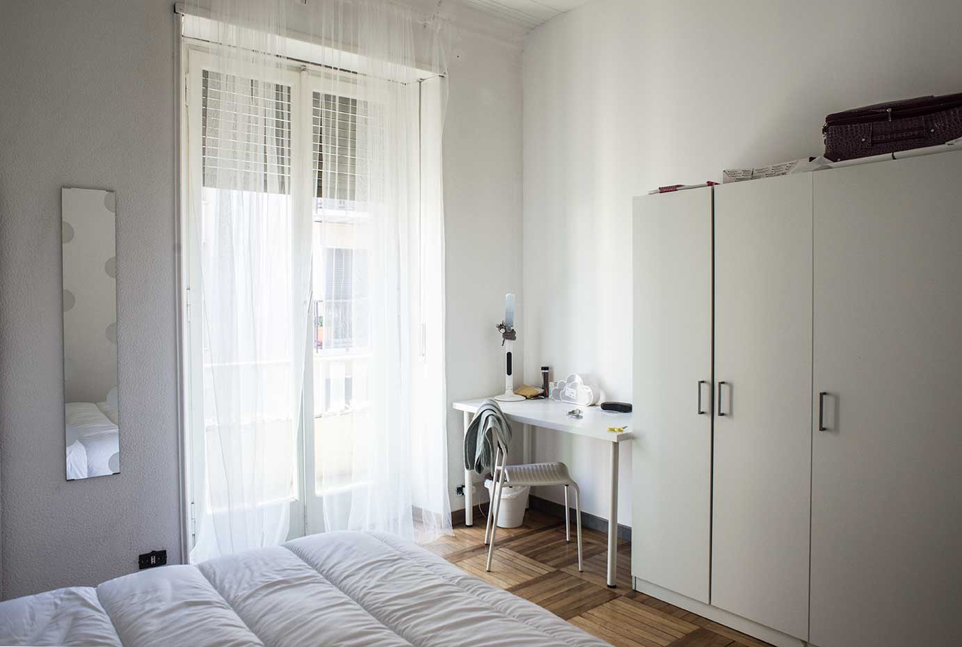 Spaziosa singola luminosa e arredata con letto a 2 piazze, scrivania, armadio, libreria e sedia.