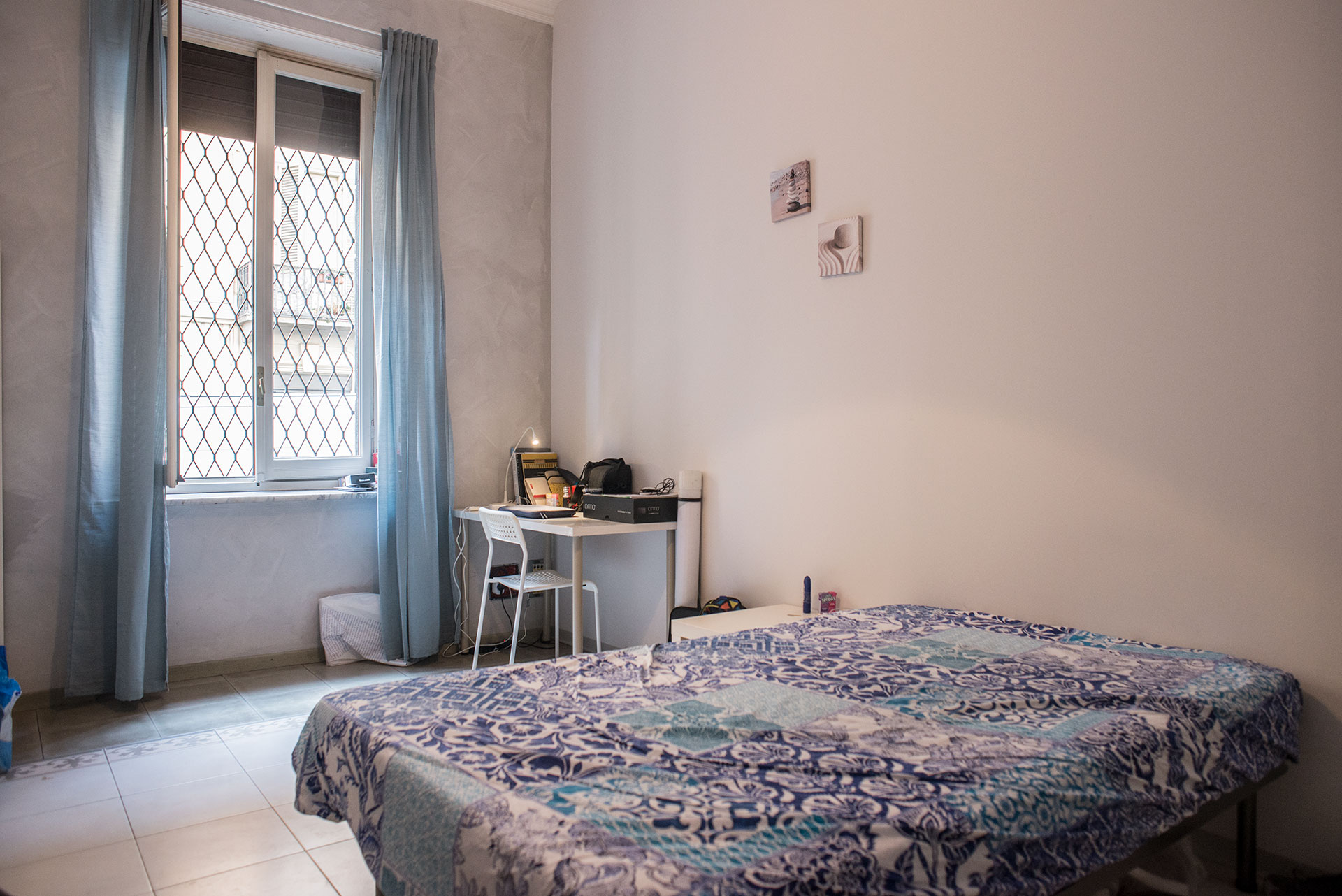 Spaziosa singola luminosa e arredata con letto piazza e mezza, scrivania, armadio, libreria e sedia.