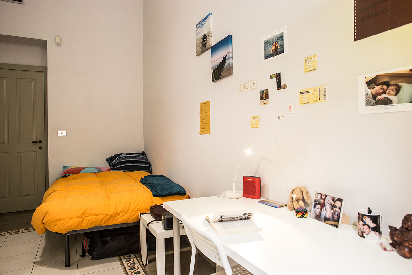 Camera singola arredata di recente con letto da una piazza e mezza, armadio, scrivania, libreria. Dotata di balcone e molto luminosa.