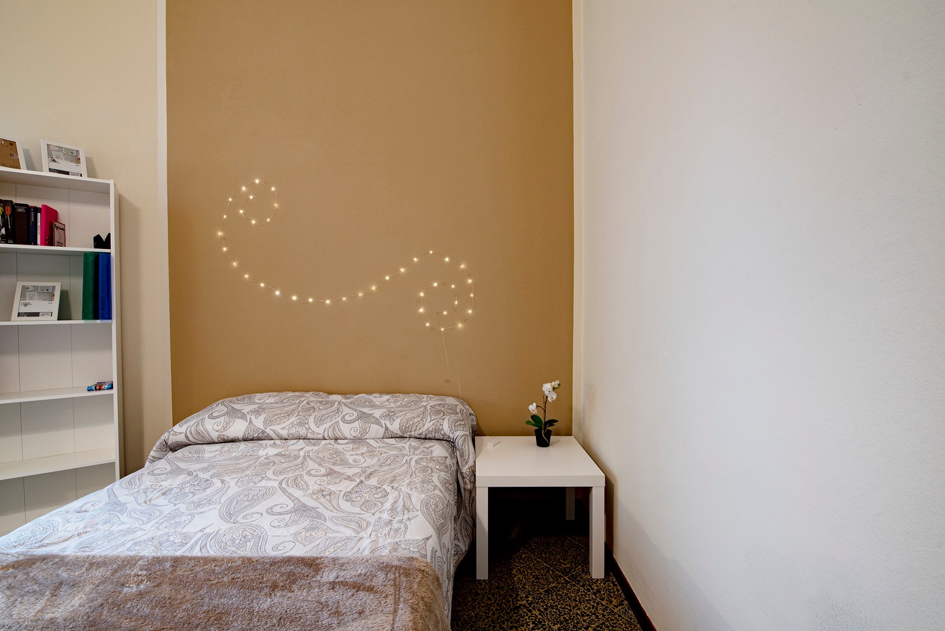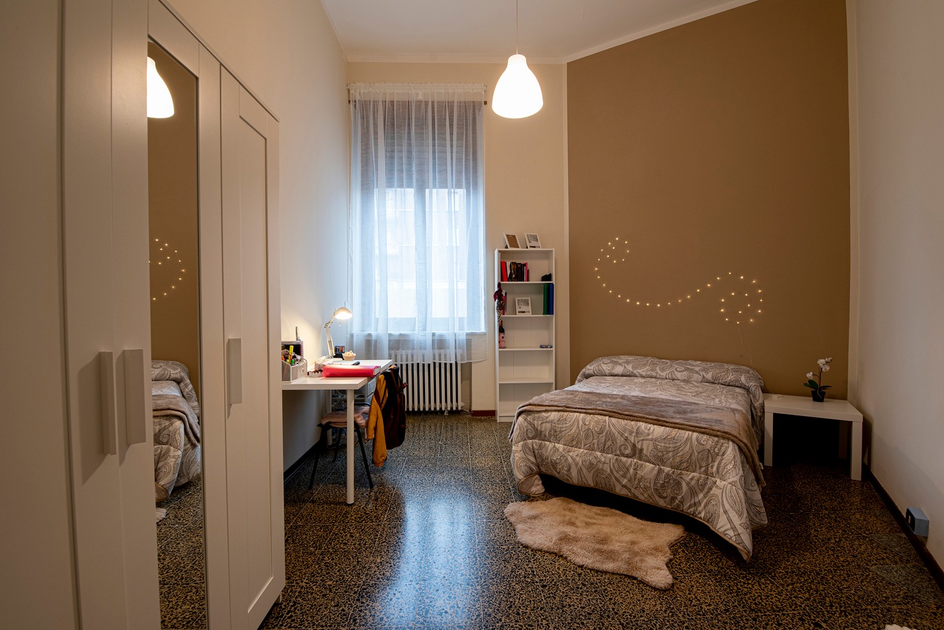 Singola luminosa e arredata con letto a 1 piazza e mezza, scrivania, armadio, libreria, sedia, comodino e stendino.