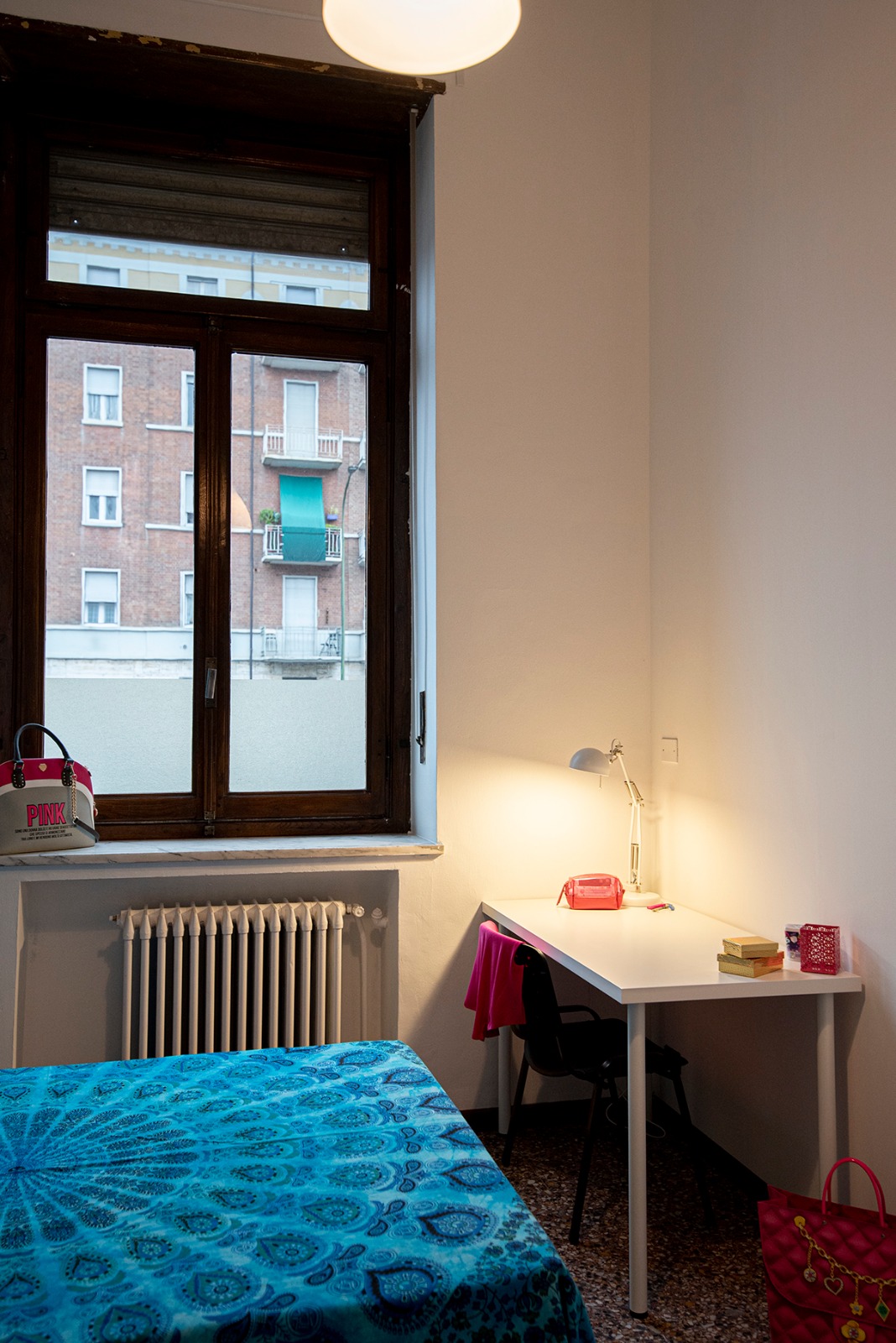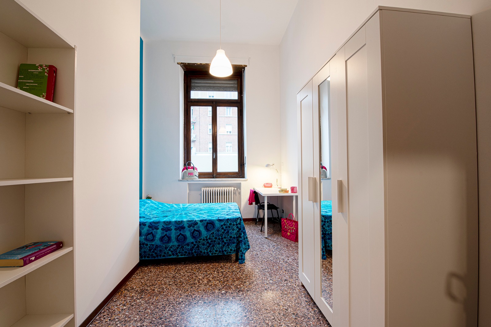 Singola luminosa e arredata con letto a 1 piazza e mezza, scrivania, armadio, libreria, sedia, comodino e stendino. Il costo mensile è forfettario ed è comprensivo di: luce, gas, riscaldamento, internet, spese condominiali, immondizia e pulizia degli spazi comuni 1 volta ogni 2 settimane.