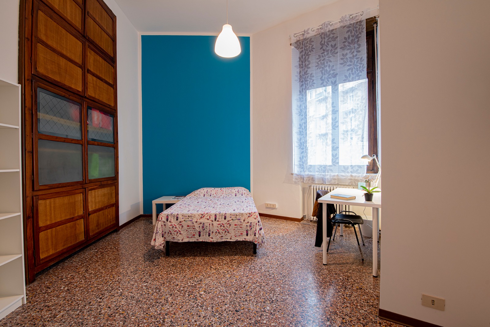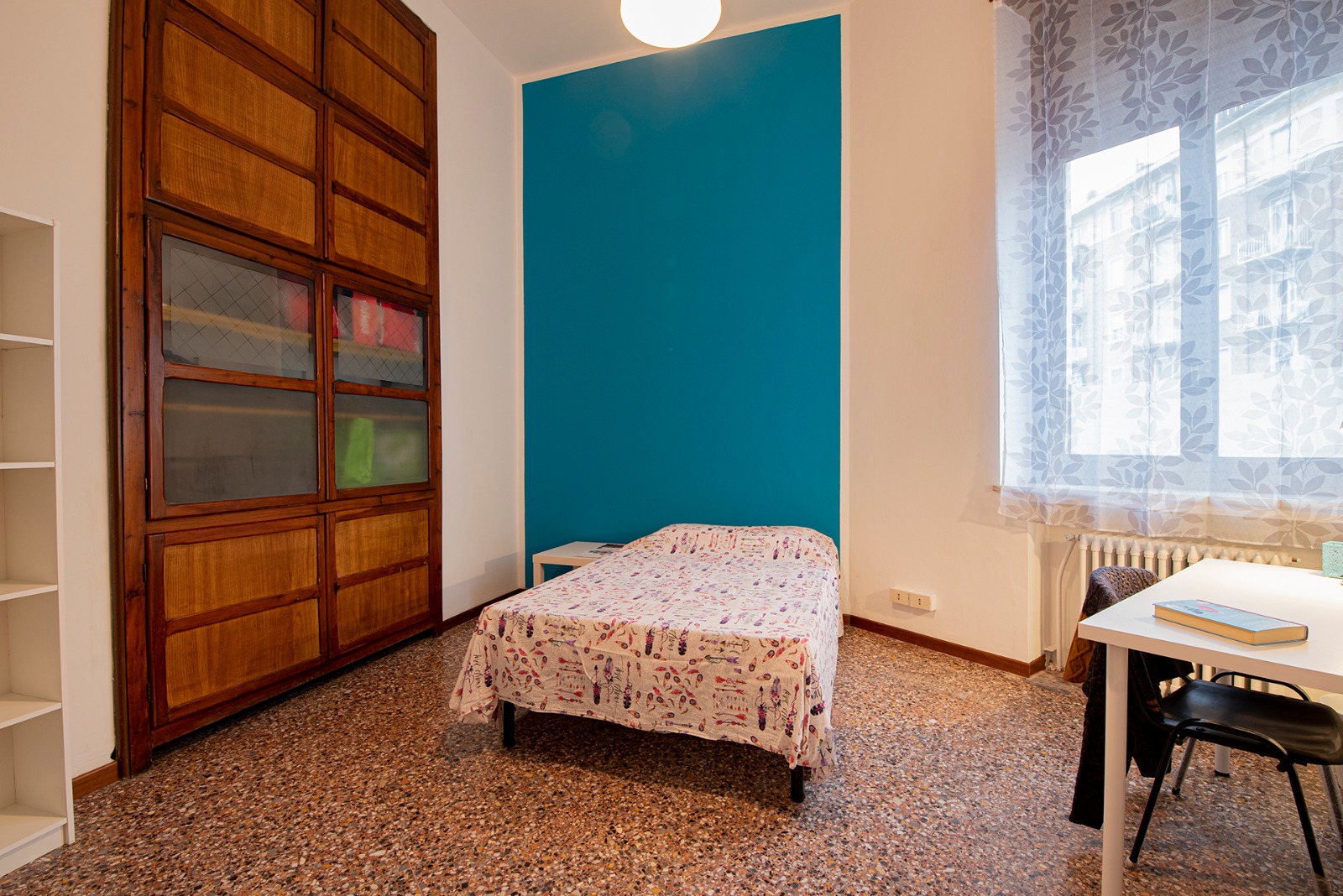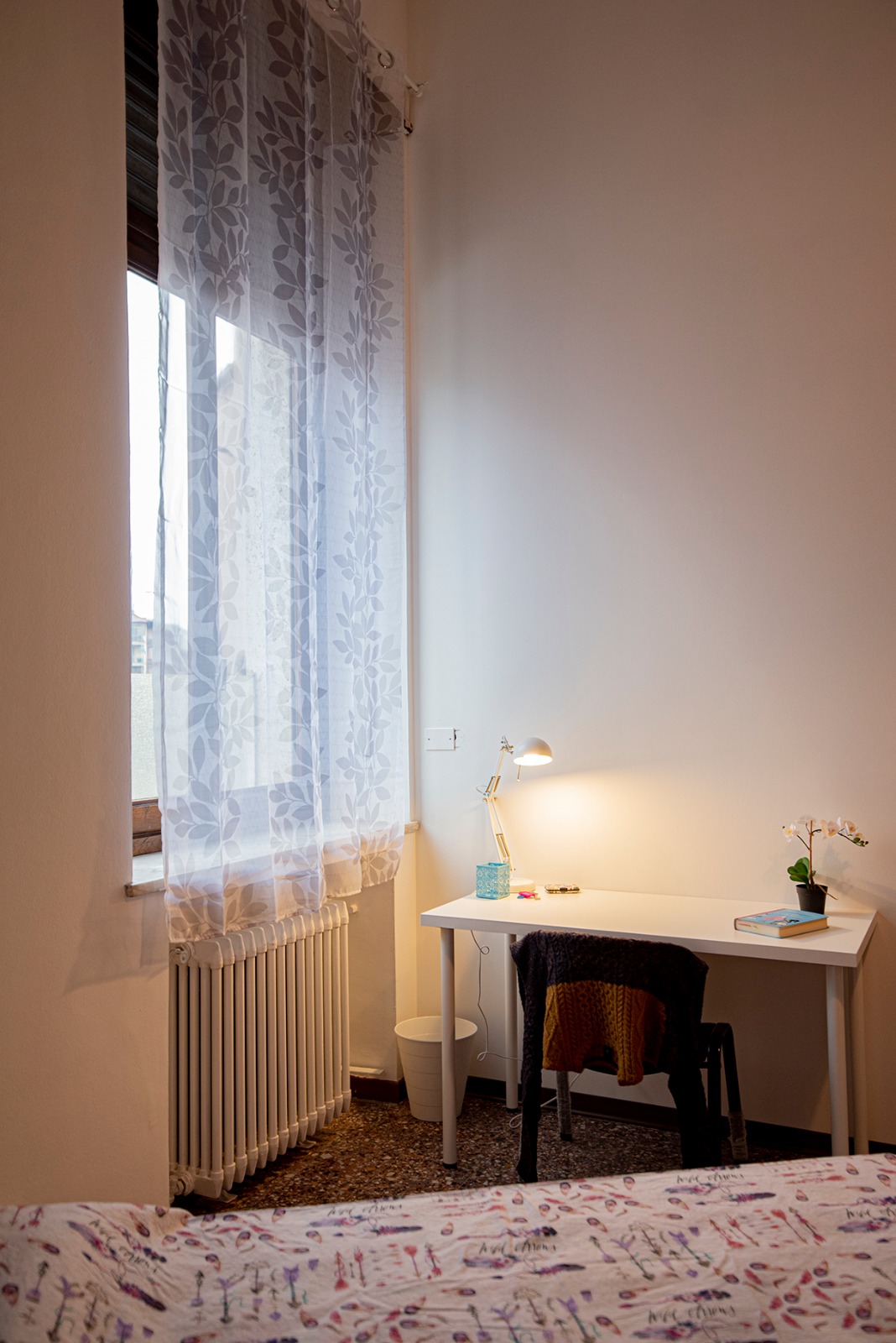 Singola luminosa e arredata con letto a 1 piazza e mezza, scrivania, armadio, libreria, sedia, comodino e stendino. Il costo mensile è forfettario ed è comprensivo di: luce, gas, riscaldamento, internet, spese condominiali, immondizia e pulizia degli spazi comuni 1 volta ogni 2 settimane.