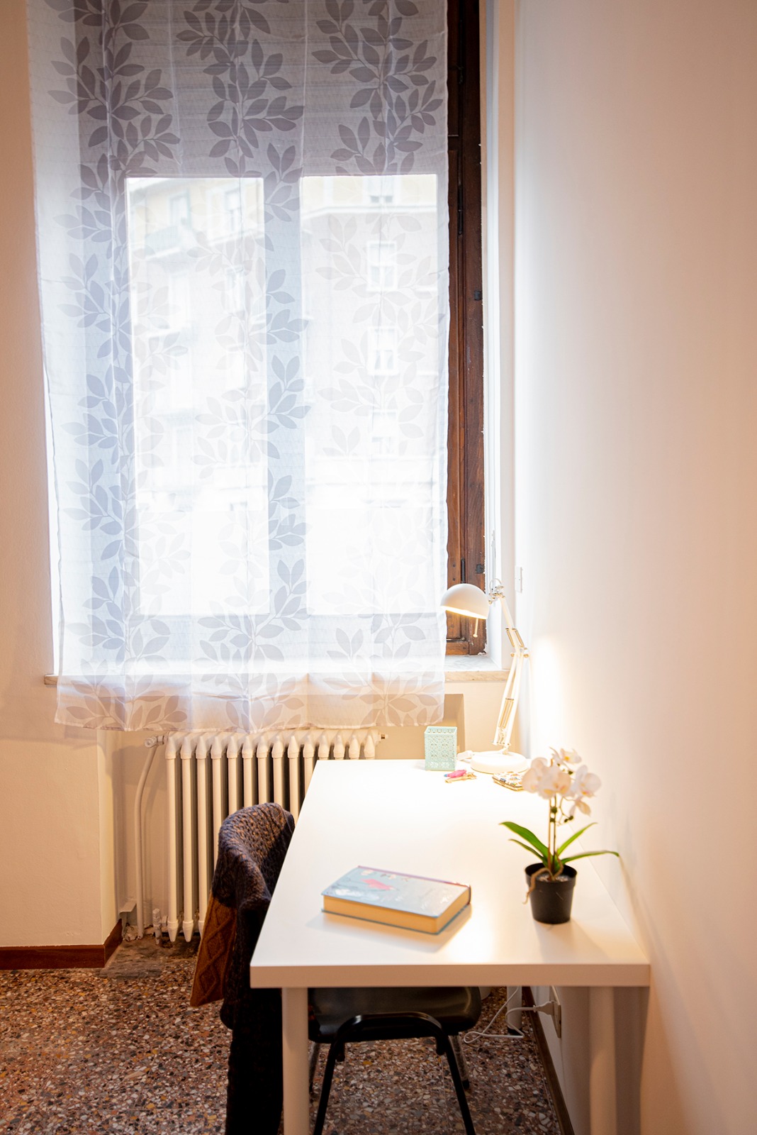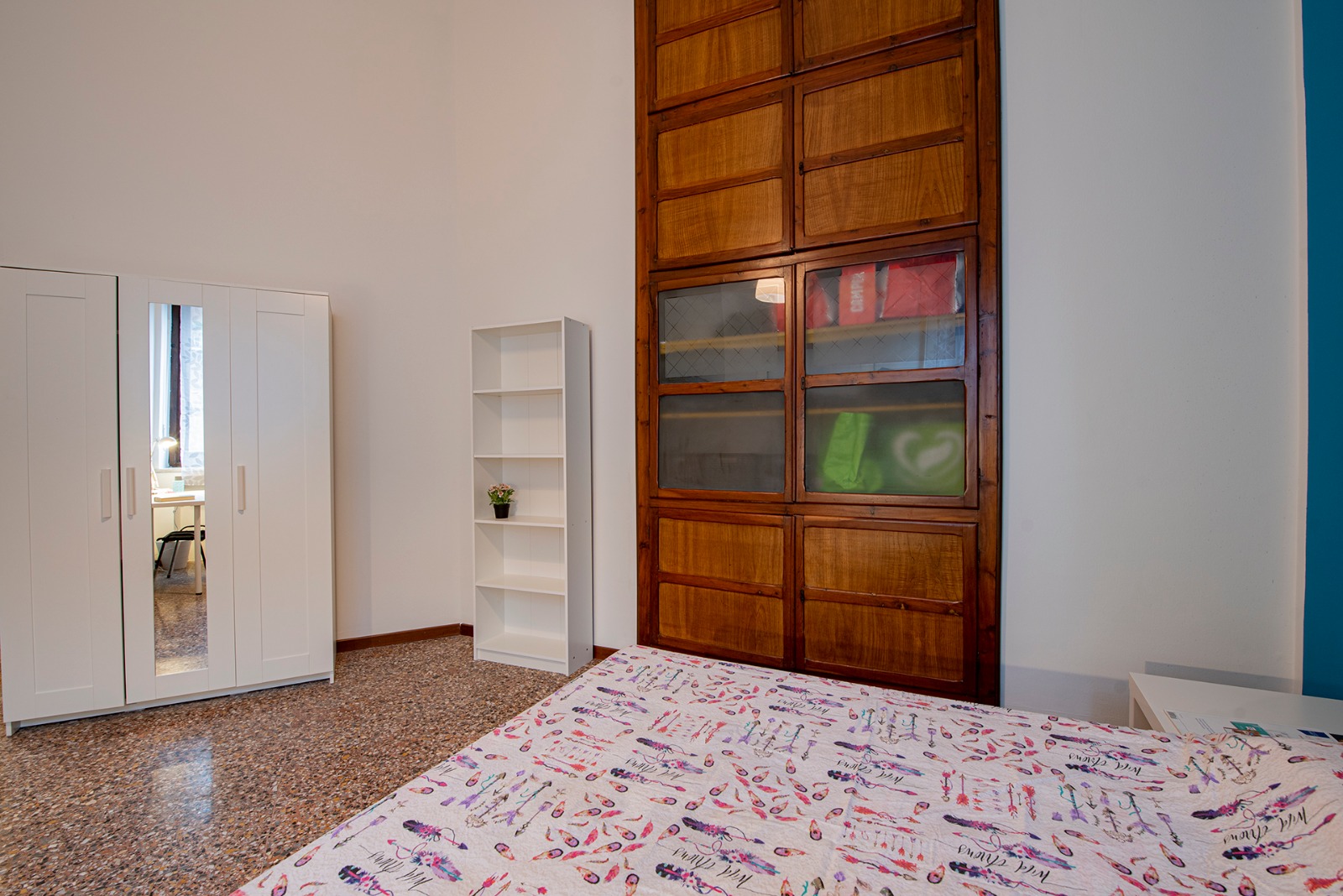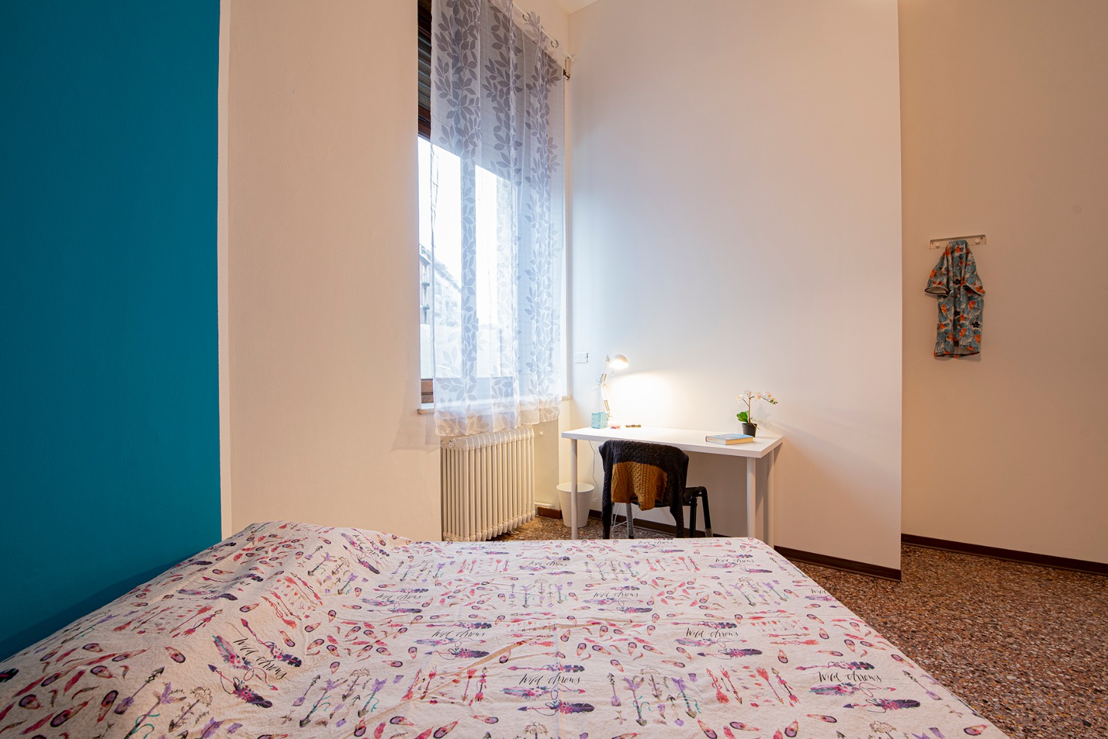 Singola luminosa e arredata con letto a 1 piazza e mezza, scrivania, armadio, libreria, sedia, comodino e stendino. Il costo mensile è forfettario ed è comprensivo di: luce, gas, riscaldamento, internet, spese condominiali, immondizia e pulizia degli spazi comuni 1 volta ogni 2 settimane.