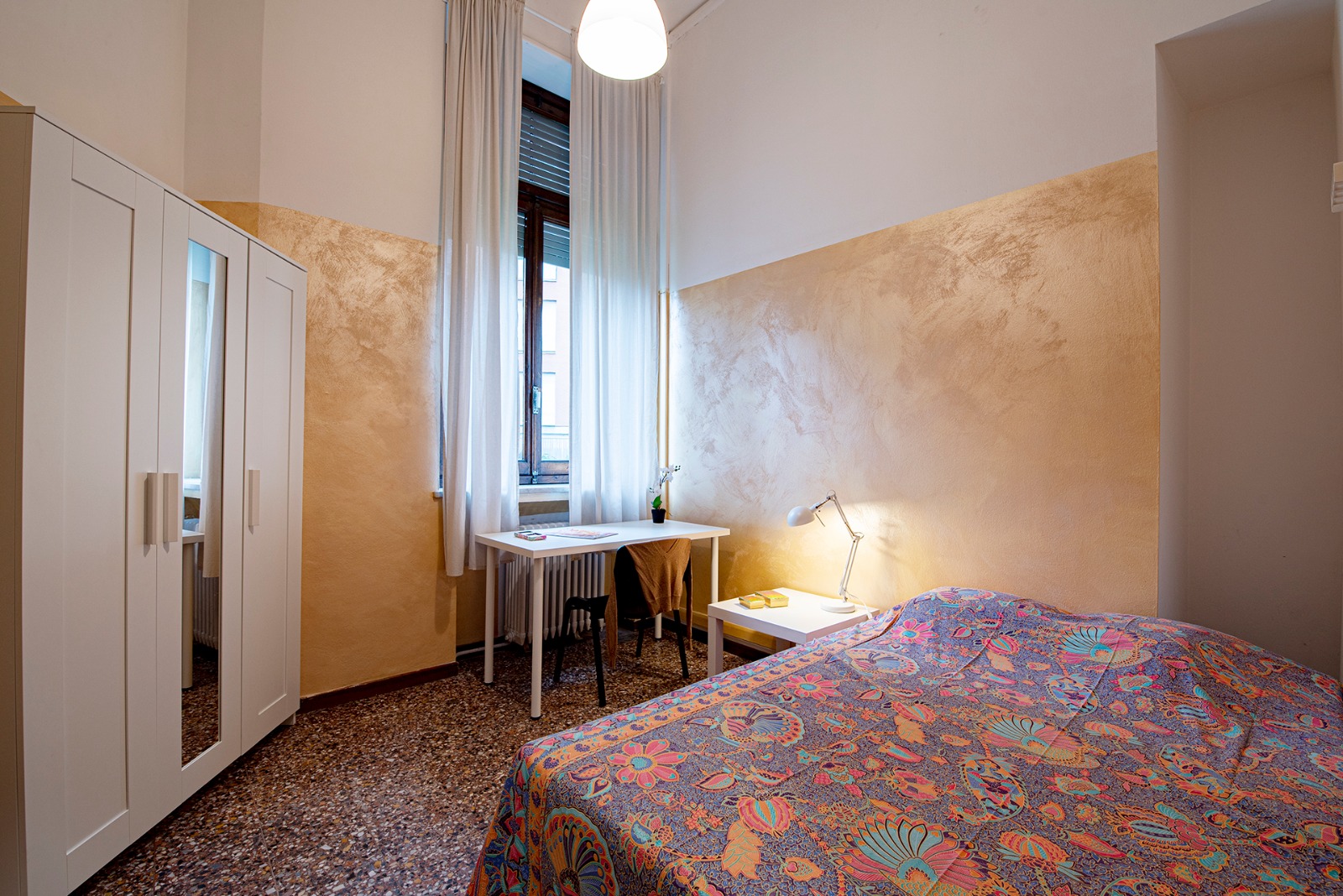 Singola luminosa e arredata con letto a 1 piazza e mezza, scrivania, armadio, libreria, sedia, comodino e stendino.